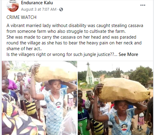 She was made to carry the cassava on her head and was paraded round the village as she has to bear the heavy pain on her neck and shame of her act..