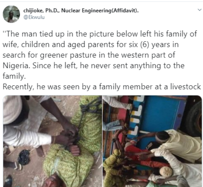 According to Ekwulu, the man was recently spotted at a livestock market in Abeokuta by a family member, who then tied him up and sent him back home via a truck.
