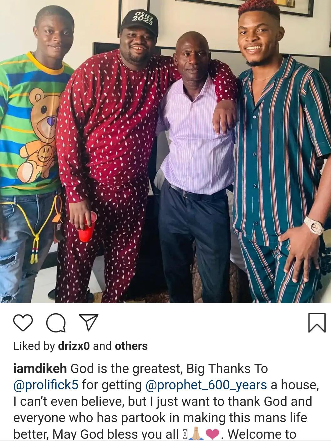 “God is the greatest, Big Thanks To @prolifick5 for getting Prophet_600_years a house, I can’t even believe, but I just want to thank God and everyone who has partook in making this mans life better, May God bless you all”