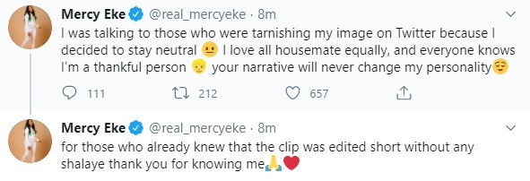She wrote: “I was talking to those who were tarnishing my image on Twitter because I decided to stay neutral. I love all housemate equally, and everyone knows I’m a thankful person. Your narrative will never change my personality.”