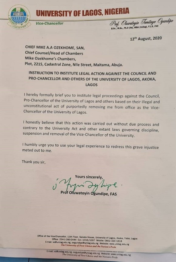 Embattled Vice Chancellor of the University of Lagos (UNILAG) Prof. Oluwatoyin Ogundipe has headed to court over his purported removal from office by the Chief Wale Babalakin (SAN) led- Governing Council.