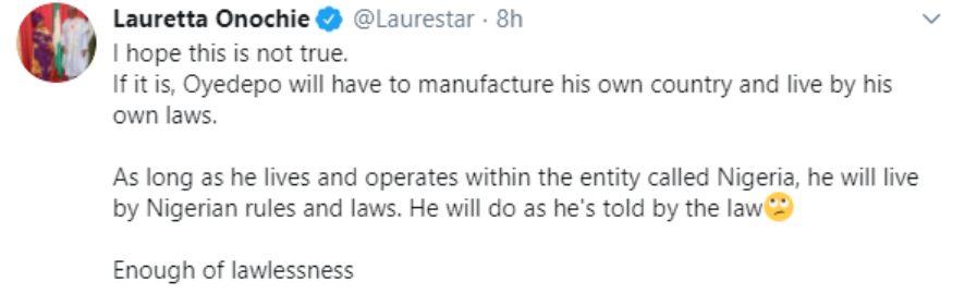 Reacting to Oyedepo’s comment, Lauretta Onochie stated that as long as Oyedepo lives and operates within the entity called Nigeria, he will live by Nigerian rules and laws.