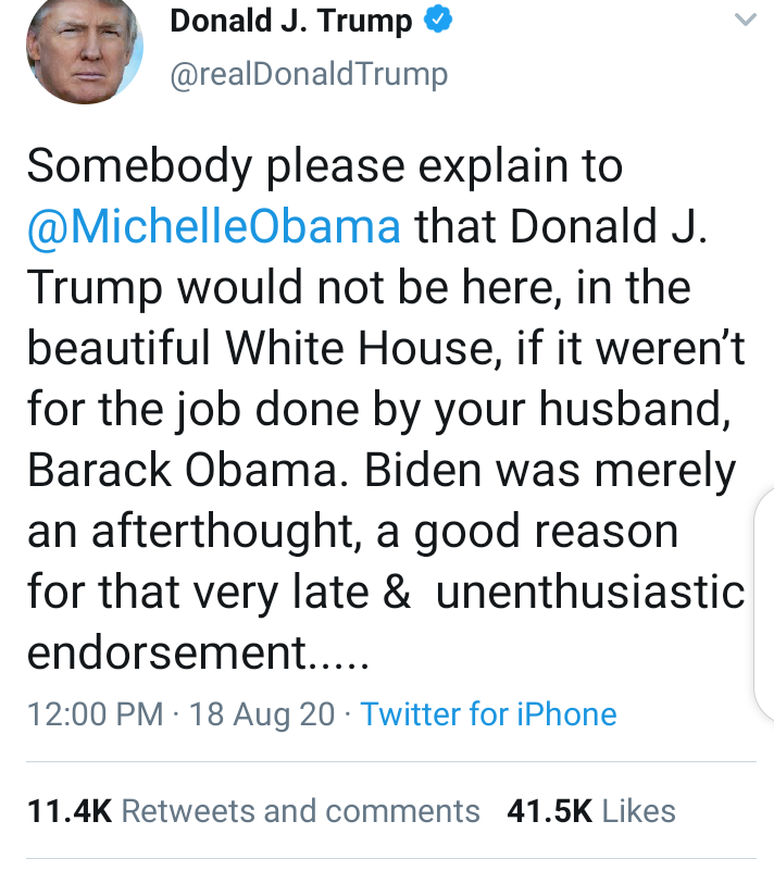 “Somebody please explain to @MichelleObama that Donald J. Trump would not be here, in the beautiful White House, if it weren’t for the job done by your husband, Barack Obama,” Trump tweeted.