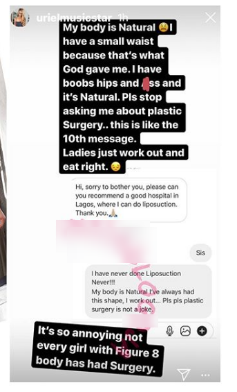 BBNaija ex housemate, Uriel has come out to talk about about undergoing body surgery. The curvy actress is obviously endowed and this has got many wondering if her body is natural or she has been under the knife.