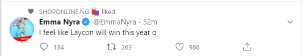 Emma Nyra today shared on Twitter that she feels BBNaija housemate Laycon will walk away with the grand prize at the end of the show.