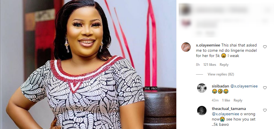 A Nigerian brand influencer, Olayemi (AOE) has taken to social media to call out actress Seyi Edun for allegedly asking her to model her lingerie for five thousand naira.
