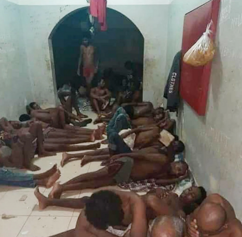Images sent via phone by migrants held inside the detention centres show dozens of emaciated men crippled by the Arabian heat lying shirtless in tightly packed rows in small rooms with barred windows.