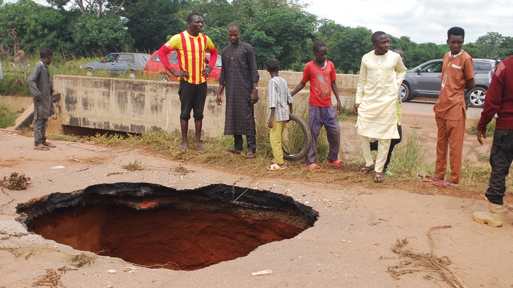 A motorcyclist identified as Suleiman Umar said he was informed that the sinkhole collapsed after two trailers carrying cement passed it which led to a circular crack on the road that later caved in.