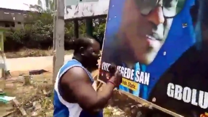 Video of a man assumed to be in his forties simply identified as Ademola laying curses with charms/voodoos for people who may attempt to tear his campaign banner in Oke-Igbo, Ondo state has surfaced online.