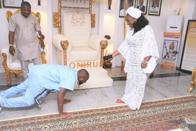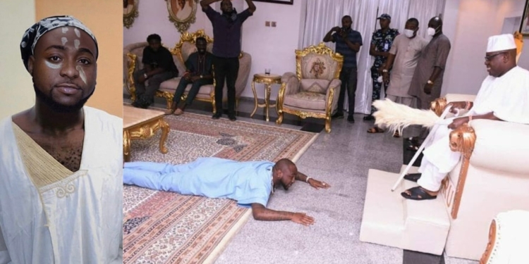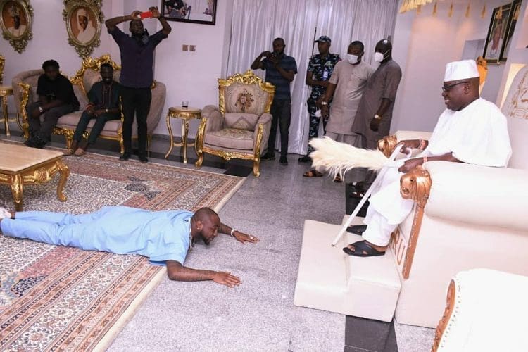 Photo of sensational singer, Davido prostrating for the new Oba of Oniru, Oba AbdulWasiu Gbolahan Lawal during his visit in Lagos has surfaced on the internet. The multiple award winning musician visited the traditional ruler in company of Seyi Tinubu, the son of the National leader of the All Progressives Congress, APC.