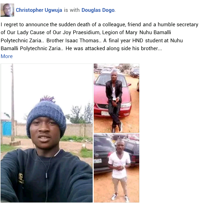 “I regret to announce the sudden death of a colleague, friend and a humble secretary of Our Lady Cause of Our Joy Praesidium, Legion of Mary Nuhu Bamalli Polytechnic Zaria.. Brother Isaac Thomas.. A final year HND student at Nuhu Bamalli Polytechnic Zaria”