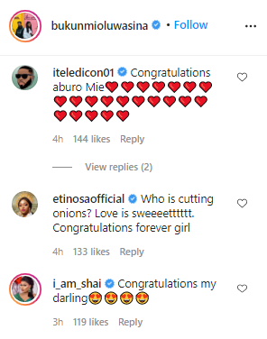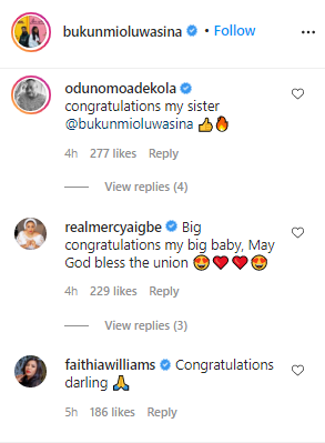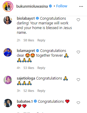 Wunmi Toriola “See me screaming like iya iyawo, congratulations darling,making this BOLD STEP at this TIME is a very great step and a beautiful decision,May God hold you both in this new journey…You will NEVER faulter….Congratulations baby girl @bukunmioluwasina”