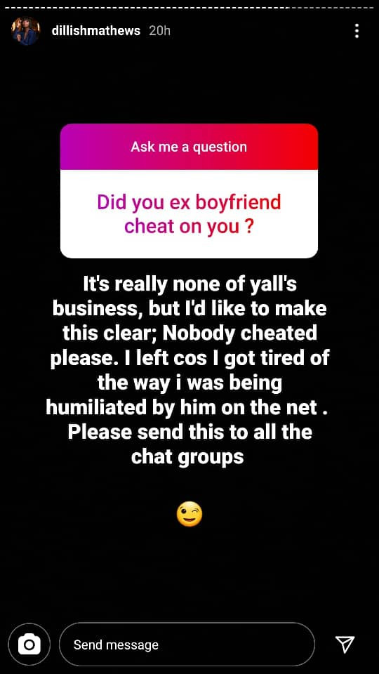 In her reply, Dillish said none of them cheated, but left the relationship because she got tired of being humiliated by the footballer on the internet.
