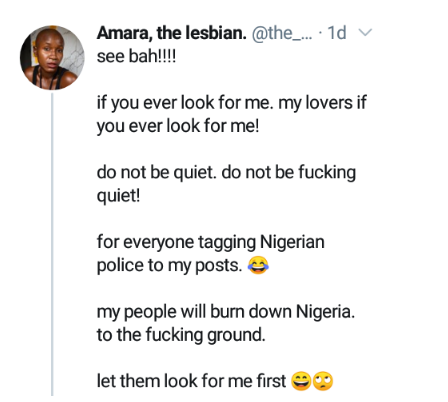 “For everyone tagging Nigerian police to my posts. my people will burn down Nigeria. to the fucking ground. Let them look for me first”
