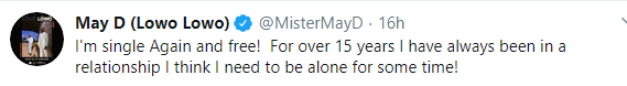Announcing the end of their union, MayD took to micro blogging platform, Twitter to celebrate. He wrote: