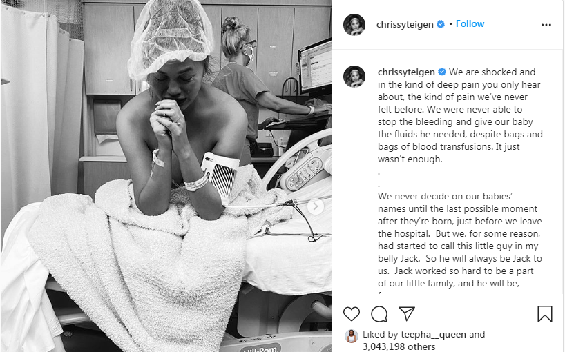 “We are shocked and in the kind of deep pain you only hear about, the kind of pain we’ve never felt before. We were never able to stop the bleeding and give our baby the fluids he needed, despite bags and bags of blood transfusions. It just wasn’t enough,” Teigen wrote: