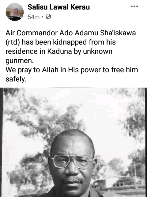 Ado Adamu Sha’iskawa, a retired Air Commodore in the Nigerian Air Force has been abducted by unknown gunmen suspected to be kidnappers in Kaduna.
