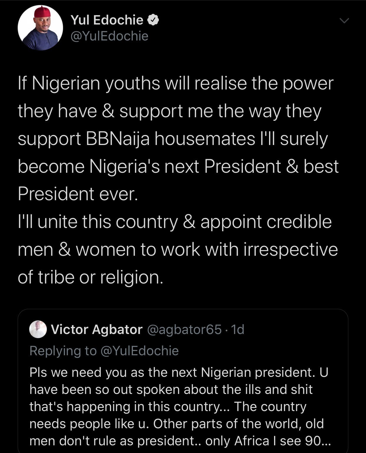 “If Nigerian youths will realise the power they have & support me the way they support BBNaija housemates, I’ll surely become Nigeria’s next President & best President ever.