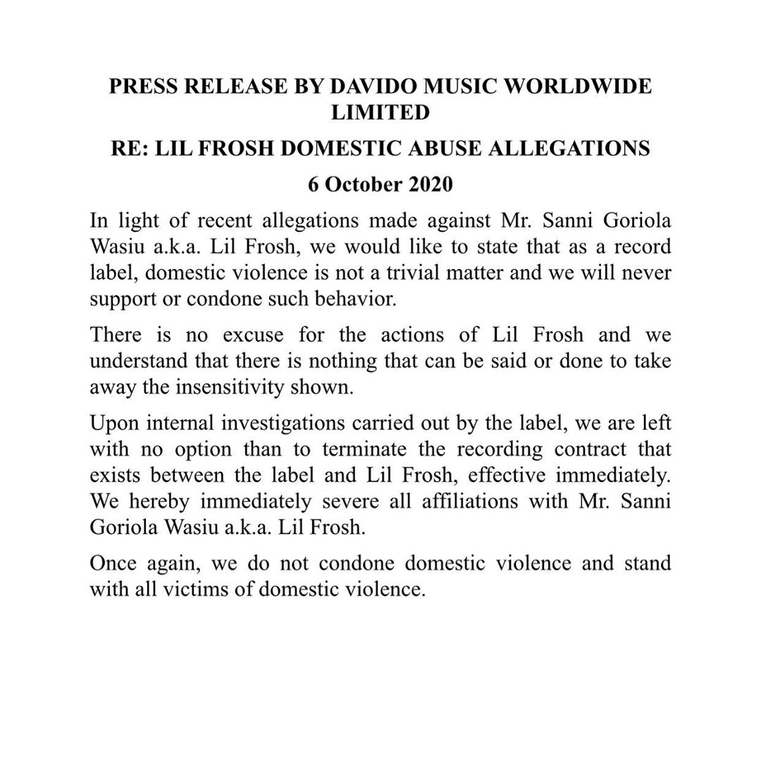 Davido took to his official Instagram moments ago to share a press release that his record label has dissolved the contract with the youngster, saying their label doesn’t condone domestic abuse.