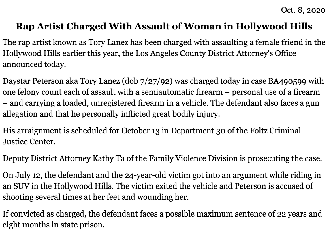 The Los Angeles County District Attorney’s office announced in a statement on Thursday, October 8, that Lanez has been charged with one felony count each of assault with a semiautomatic firearm – personal use of a firearm – and carrying a loaded, unregistered firearm in a vehicle.