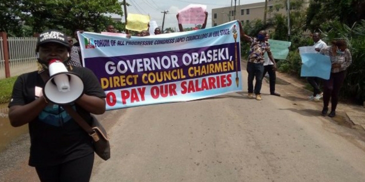 Elected councillors from 16 out of the 18 local government areas of Edo State who were suspended by Governor Godwin Obaseki on Tuesday took to the main streets of Benin to demand their reinstatement and payment of salaries and allowances.