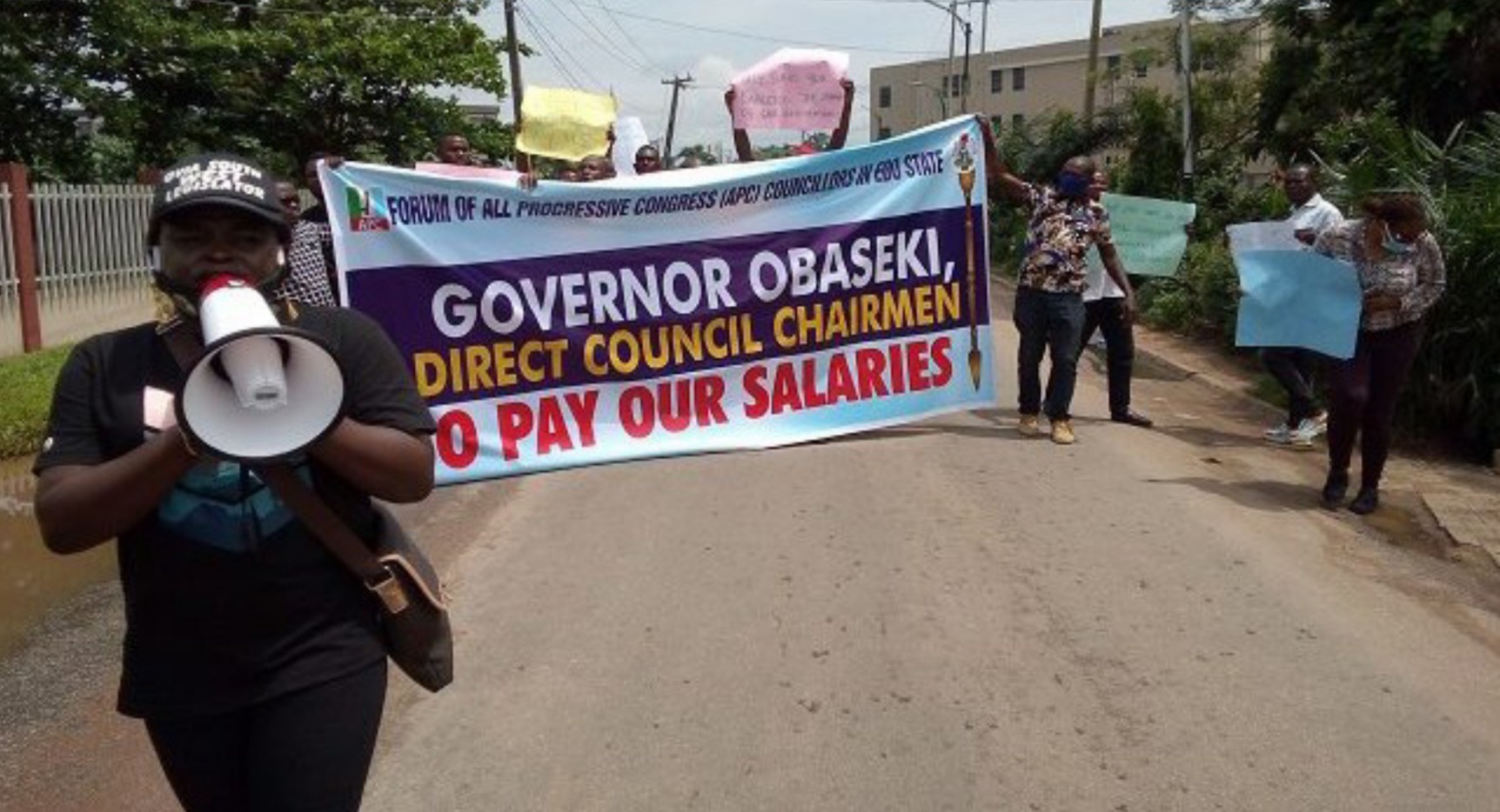 Elected councillors from 16 out of the 18 local government areas of Edo State who were suspended by Governor Godwin Obaseki on Tuesday took to the main streets of Benin to demand their reinstatement and payment of salaries and allowances.