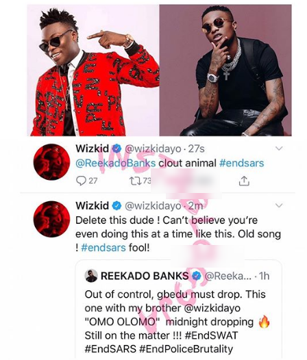 “Delete this dude ! Can’t believe you’re even doing this at a time like this. Old song ! #endsars fool!” Wizkid tweeted.
