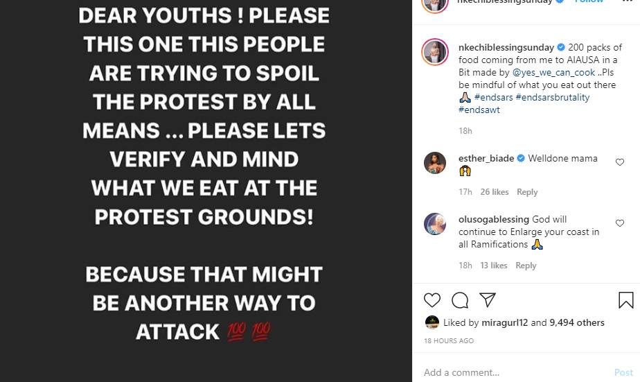 Popular Nollywood actres, Nkechi Blessing Sunday has warned #EndSARs protesters to verify the source of refreshments before consuming it.
