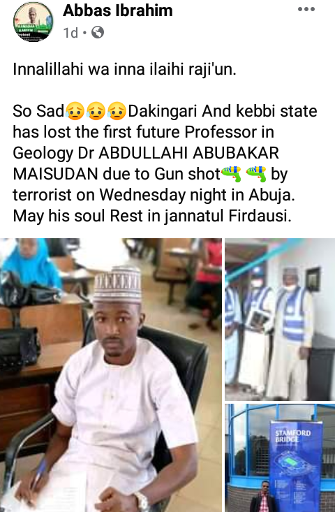 WITHIN NIGERIA learnt that the deceased identified as Abdullahi Abubakar Dakingari was killed in Abuja where he had gone to see his ailing father, who is on admission in the hospital.