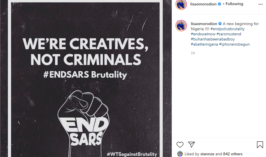 Lisa Omorodion took to her Instagram page to share an End SARS banner and wrote: