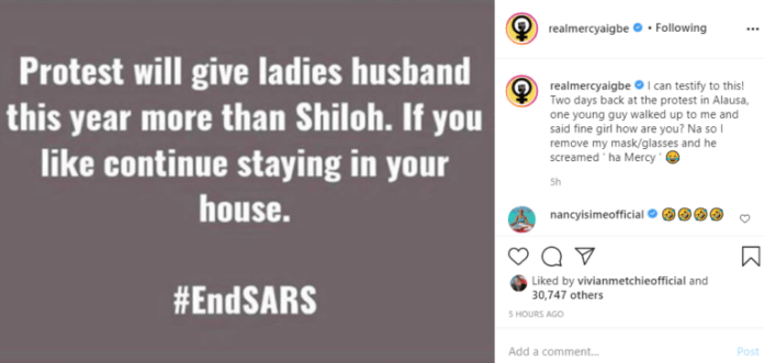 “I can testify to this! Two days back at the protest in Alausa, one young guy walked up to me and said fine girl how are you? Na so I remove my mask/glasses and he screamed ‘ ha Mercy ‘ 😂” She wrote on Instagram.