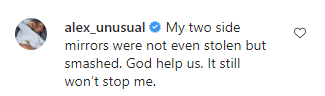 “My two side mirrors were not even stolen but smashed. God help us. It still won’t stop me.”