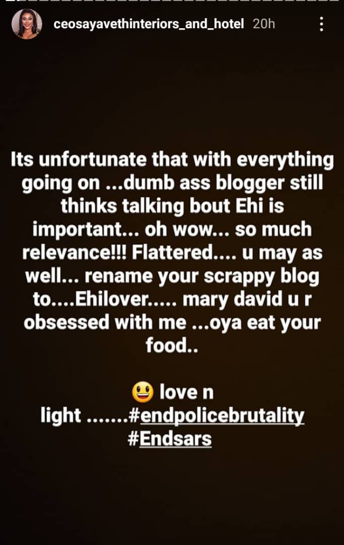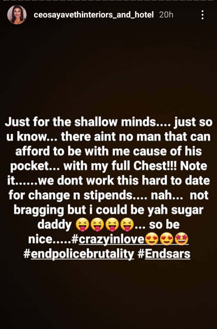 Ehi has taken to her Instagram story to continue to pour encomium on the married father of 9 adult children.