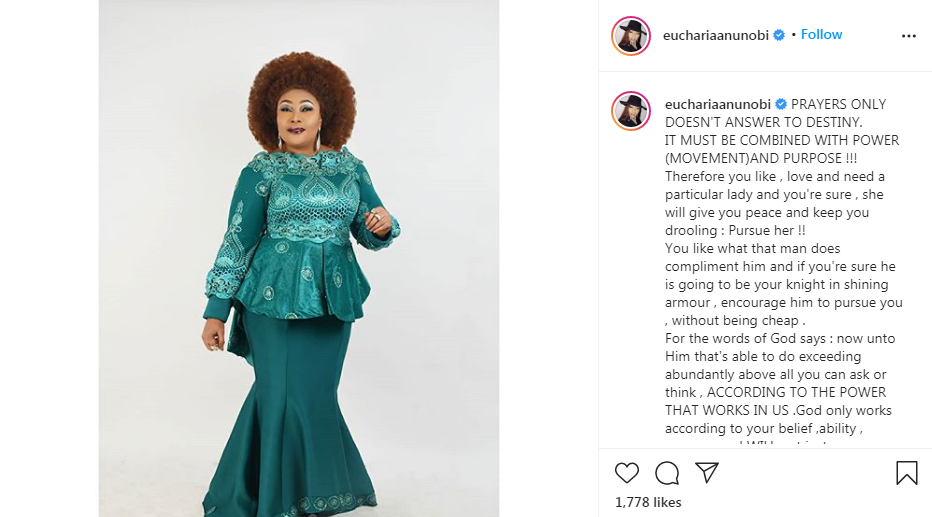 Eucharia Anuobi, a veteran Nollywood Actress cum cleric, has taken to her social media page to offer some words of advice to singles; male and females alike.
