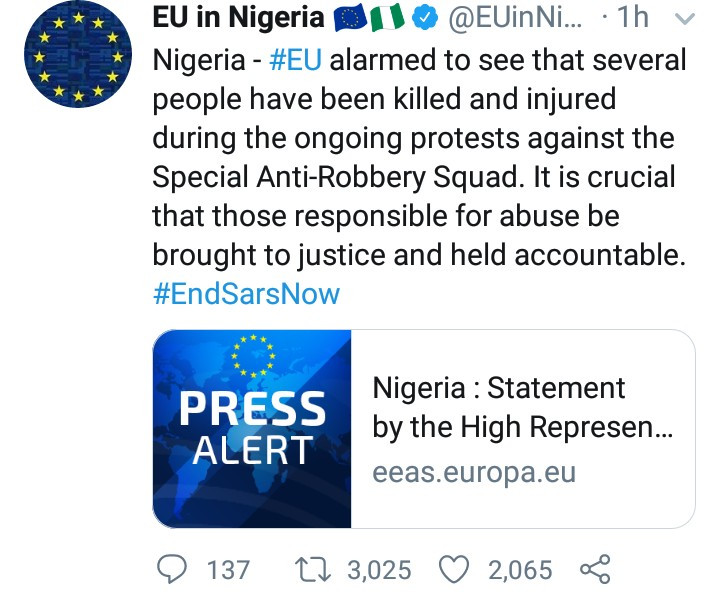 It reads: “It is alarming to learn that several people have been killed and injured during the ongoing protests against the Special Anti-Robbery Squad in Nigeria.