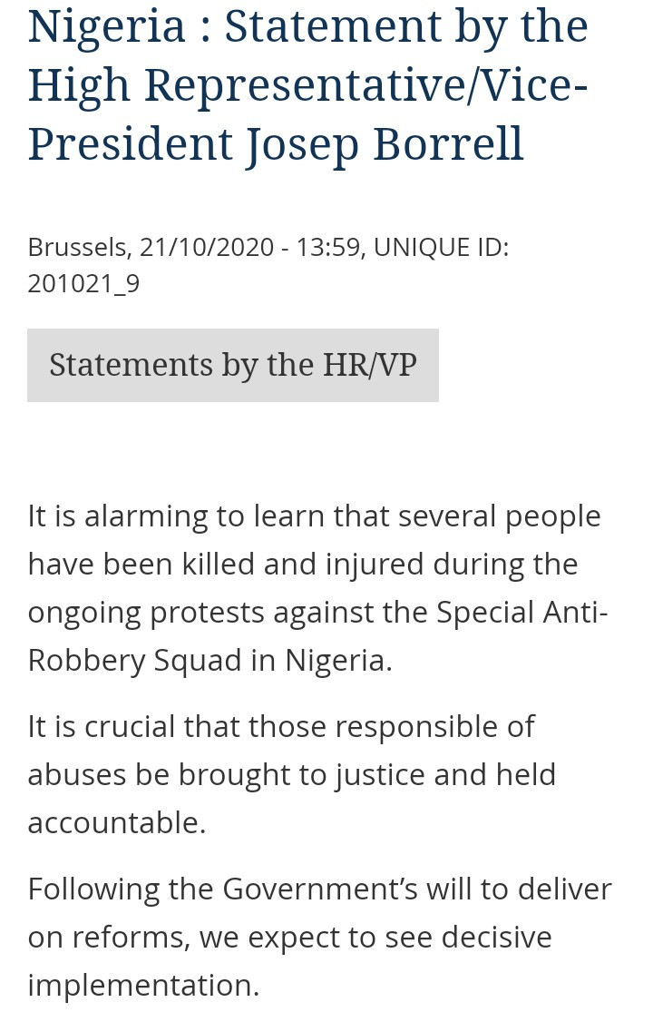 The High Representative/Vice-President of the European Union, Josep Borrell, has released a statement regarding the shooting of unarmed protesters at the Lekki toll gate.