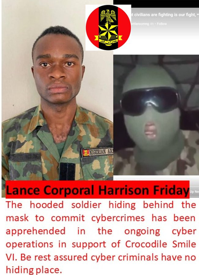 In a post shared on its Twitter handle on Wednesday, October 21, the Nigerian Army says Harrison carried out ‘cybercrime’ and that he has now been arrested.