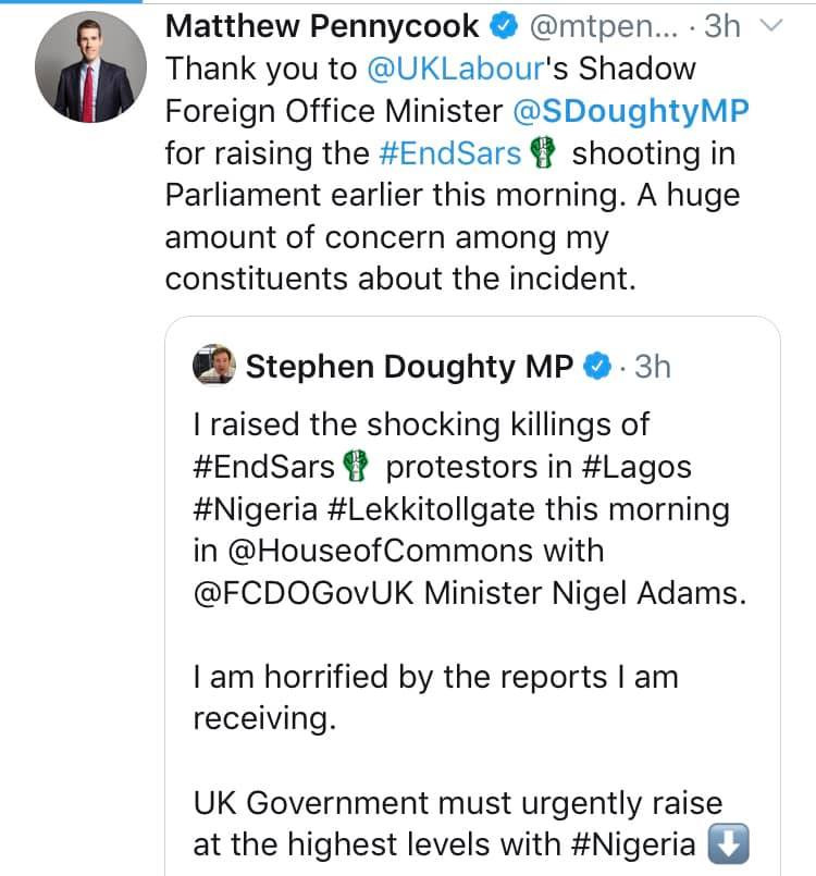 “I raised the shocking killings of End Sars protestors in Lekki toll gate, Lagos Nigeria this morning in the House of Commons with FCDOGovUK Minister Nigel Adams.