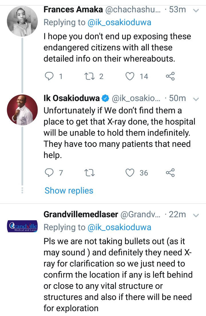 Grandville wrote: “Pls we are not taking bullets out (as it may sound ) and definitely they need X-ray for clarification so we just need to confirm the location if any is left behind or close to any vital structure or structures and also if there will be need for exploration.”