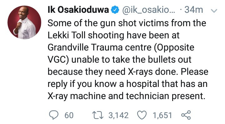 He wrote: “Some of the gun shot victims from the Lekki Toll shooting have been at Grandville Trauma centre (Opposite VGC) unable to take the bullets out because they need X-rays done. Please reply if you know a hospital that has an X-ray machine and technician present.”