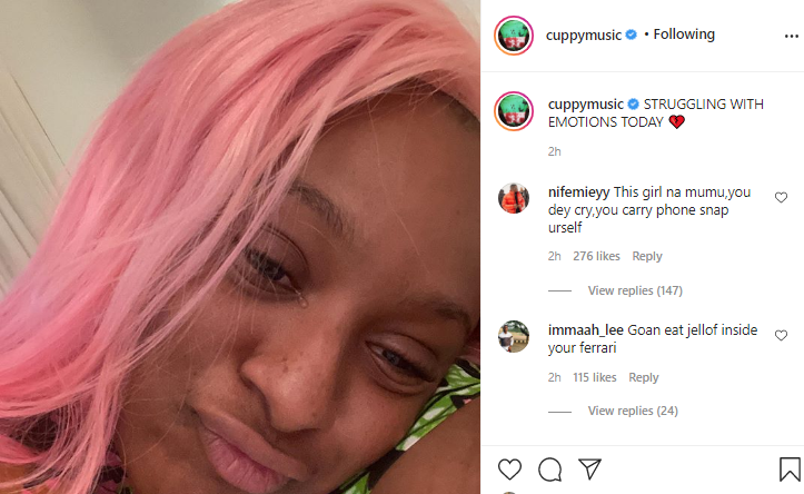 Nigerians have stormed the comment section of billionaire’s daughter, Florence Ifeoluwa Otedola popularly known as DJ Cuppy on Instagram to blast her for sharing a photo of herself crying.