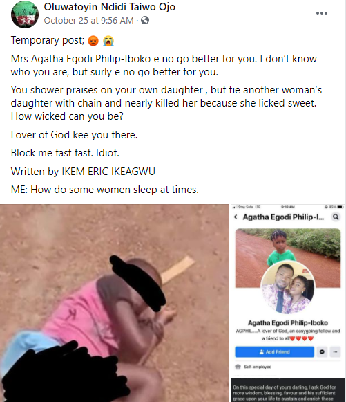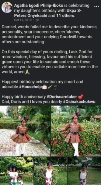 Prior to this incident, Agatha, who is serving with the ministry of Agriculture, Ebonyi State, had put up photos of her househelp and praised her for her “undying goodwill towards others” and for being a great caretaker for her daughter Doris.
