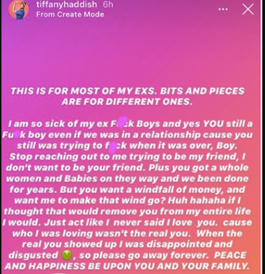 “I am sick of my ex F–k Boys and yes YOU still a F–k boy even if we was in a relationship cause you still was trying to f–k when it was over. Boy. Stop reaching out to me trying to be my friend, I don’t want to be your friend. Plus you got a whole woman and Babies on they way and we been done for years. But you want a windfall of money, and want me to make that wind go? Huh hahaha if I thought that would remove you from my entire life I would. Just act like I never said I love you.”