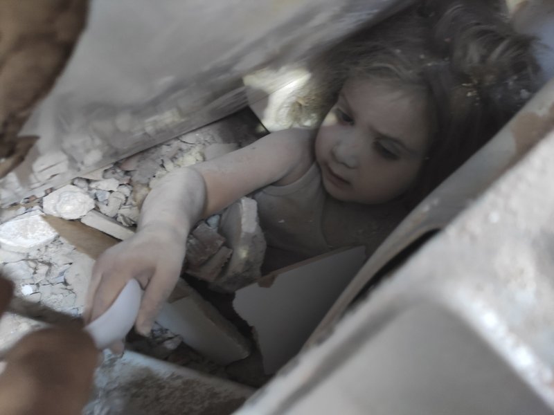 The child, whose hair was caked with dust, was immediately wrapped in a gold foil blanket and carried to an ambulance through a sea of rescue workers.
