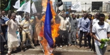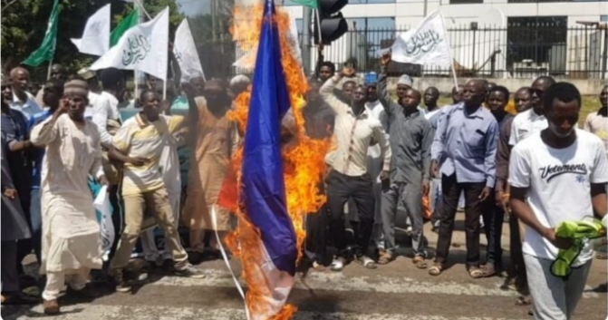 The flag of France was on Tuesday burnt in the federal capital territory by aggrieved members of the Islamic Movement of Nigeria (IMN) over President Emmanuel Macron’s comments on cartoons of Prophet Mohammed published in a magazine.