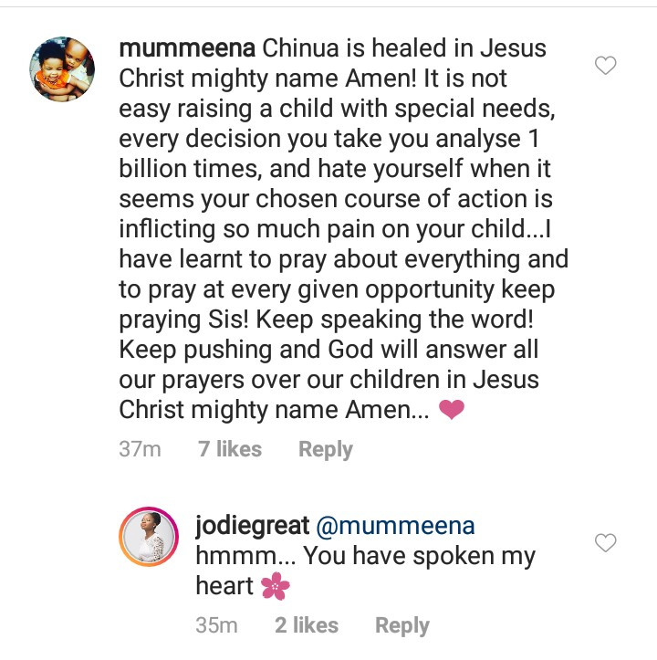 She called on her followers to join her in praying for her son Chinua as he undergoes physiotherapy.