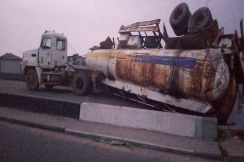 The 33,000 litre capacity tanker upturned early Sunday morning while ascending the Festac Link Bridge.
