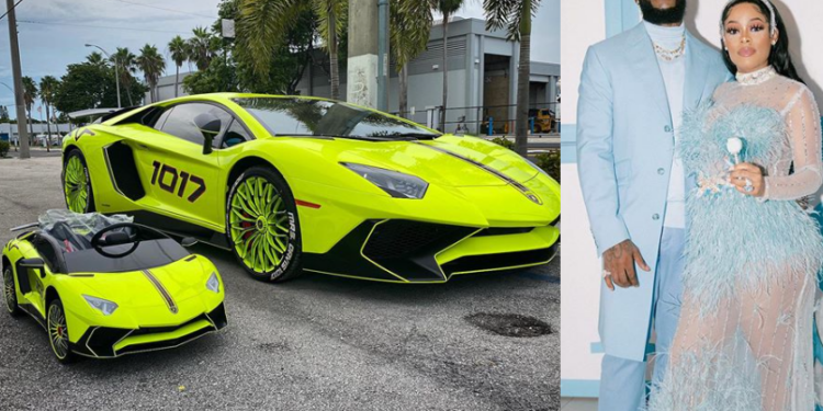 Ahead of their child’s birth, the American rapper has gifted his pregnant wife a Lamborghini Aventador and a mini-version of the sports car for their soon-to-be-born son, Davis.