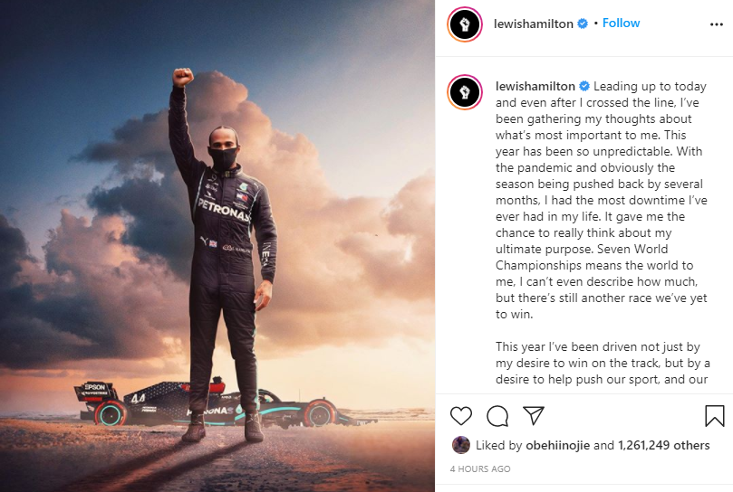 This year I’ve been driven not just by my desire to win on the track, but by a desire to help push our sport, and our world to become more diverse and inclusive. I promise you I am not going to stop fighting for change. We have a long way to go but I will continue to push for equality within our sport, and within the greater world we live in.