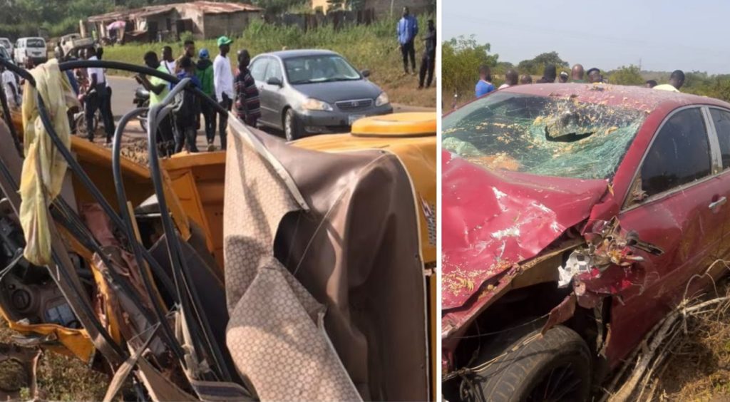The Toyota Camry with registration number SMK 568 GL and the commercial Keke NAPEB TVS had a head-on collision around 10:30 am on Wednesday.